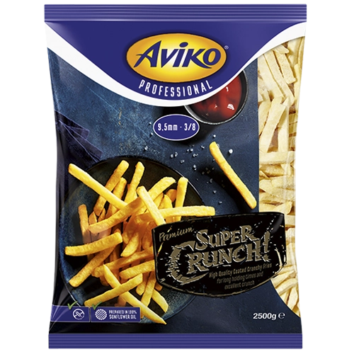 Aviko Super Crunch Fries 9,5 mm su smrznuti krumpirići s posebnim premazom koji ih čini izuzetno hrskavima i dulje održava vrućima. Ostanite u trendu uz ovaj ukusan pomfrit pripremljen s bezglutenskim premazom za dodatnu hrskavost. Dulje vrijeme zadržavanja topline i otpornost na vlagu čine ga prikladnima za dostavu i hranu za van, a osim toga smanjuje gubitke. Super Crunch krumpirići odlično se slažu s burgerima, hot-dogovima i raznim mesnim ili ribljim jelima. Također, prikladni su za bezglutensku, vegetarijansku i vegansku prehranu.